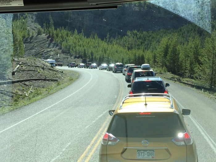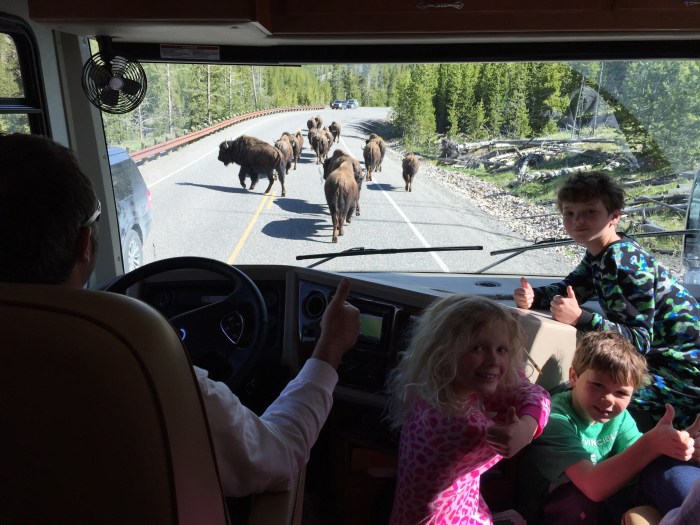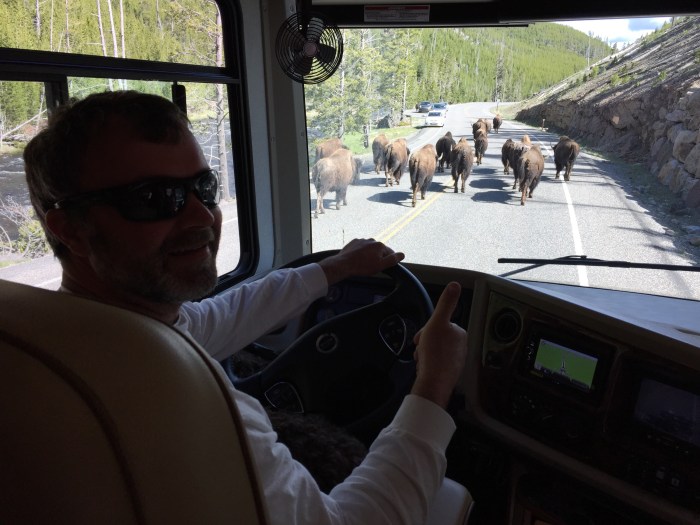 We left the “big yellow turd” behind and headed toward Greybull through Yellowstone. Stopped at the Artist’s Paintpot. It was not nearly as cool as some of the other places we went but there was a beautiful view of snow capped mountains. From there we were headed to the Fishing Village but got slowed dramatically by a herd of bison that travelled down the road for miles blocking traffic both ways! We started out about 12 cars back but we were blocked by bison when other cars went by so we were right behind them for about 1/2 hour. Everyone was totally entertained.
