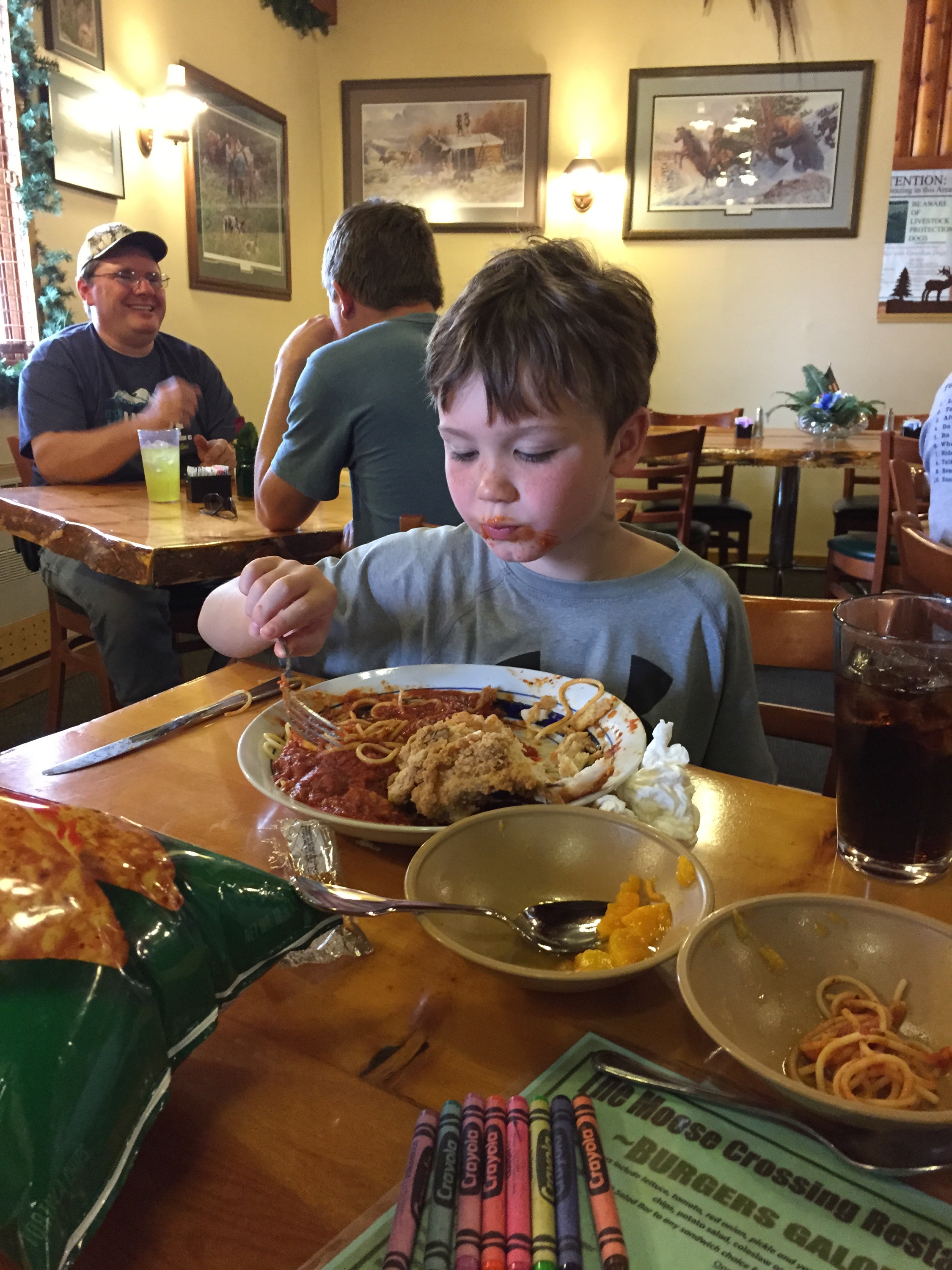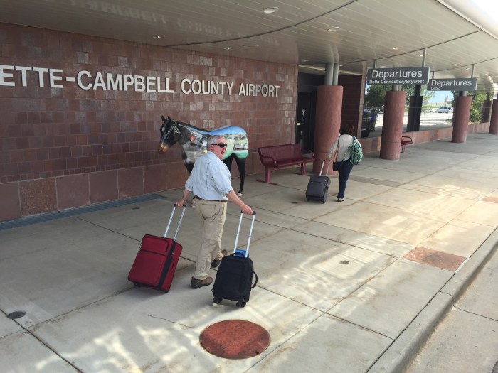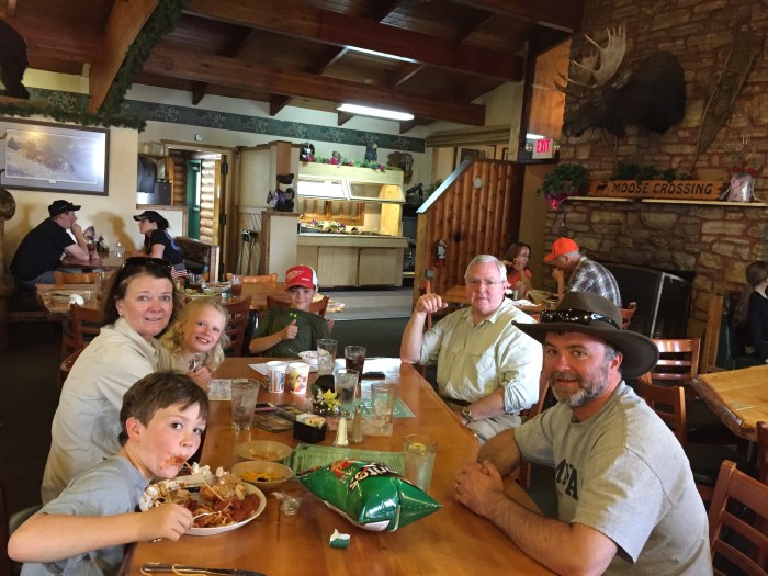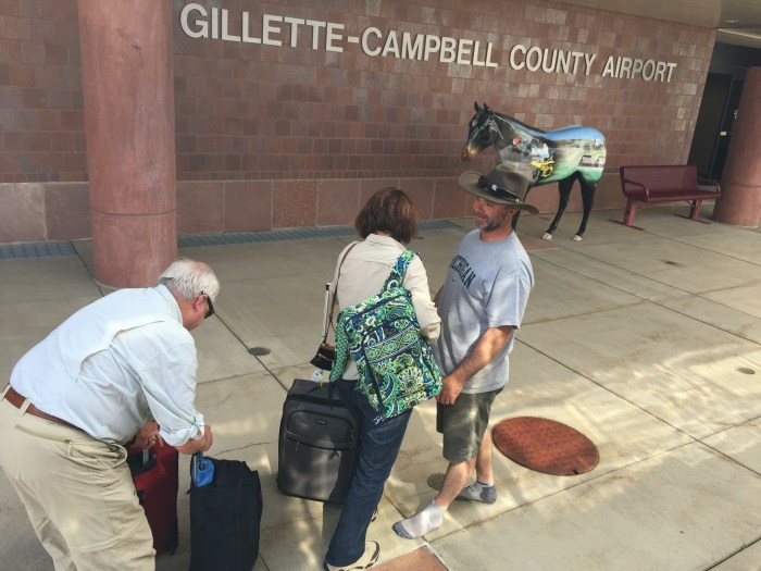 Thanks to lack of wifi/cell coverage combined with general lack of knowledge about the amount of time it takes to get to Gillette we were sitting at lunch in this charming lodge in Wyoming when we realized we needed to pack up our food and run! Even with that crafty move my dad is still driving like a bat out of hell to get there. Jason is watching his phone and telling him each minute he shaves off of the time. 😁😁😁 oops!