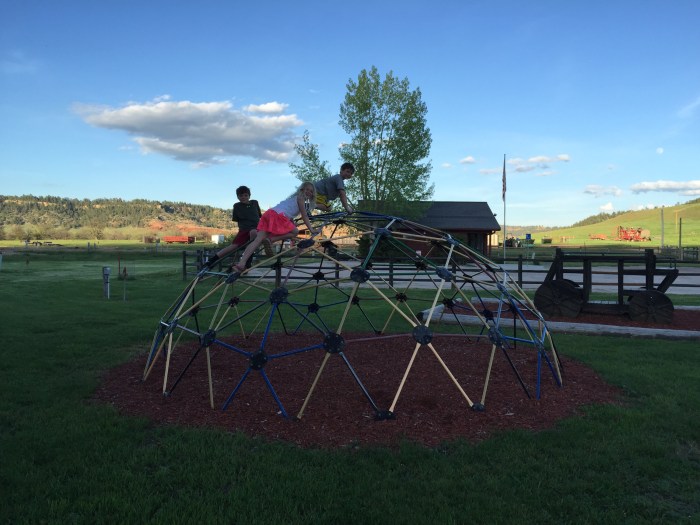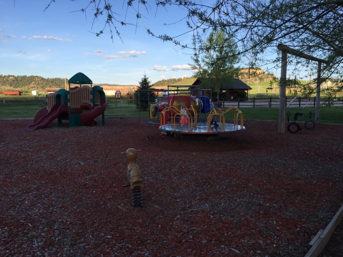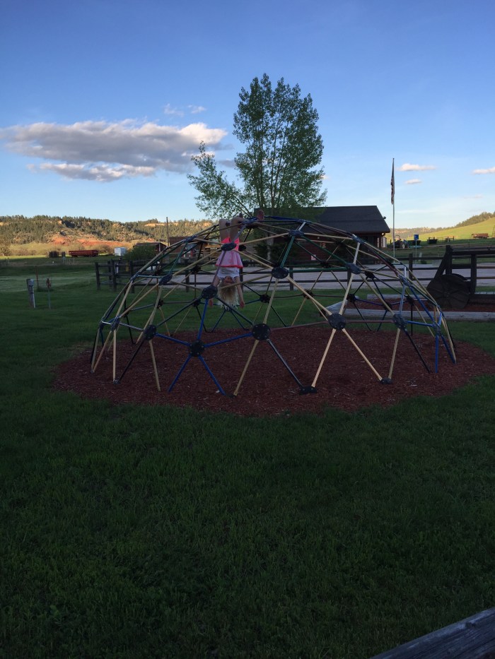 We made a quick stop at the grocery store and Wendy’s then off to the Devil’s Tower KOA. Originally supposed to go to Hill City but that was WAYYY too aggressive. Looked like a sweet location and lots of fun stuff to do. Community bonfire, hayride and a showing of Encounters of something movie that was filmed there. And there is a pool which is nice because it is finally hot! We decided to run up and check out the tower and we lucked out and got the Jr. ranger books too. Kids loved the prairie dogs at the base. I called the KOA to figure out timing on the movie & hayride so we wouldn’t miss them. Turns out they aren’t doing either one right now for various bs reasons. At least we didn’t have to rush back… When we got there to check in we discovered a lovely playground. Kids had fun there while we got settled.