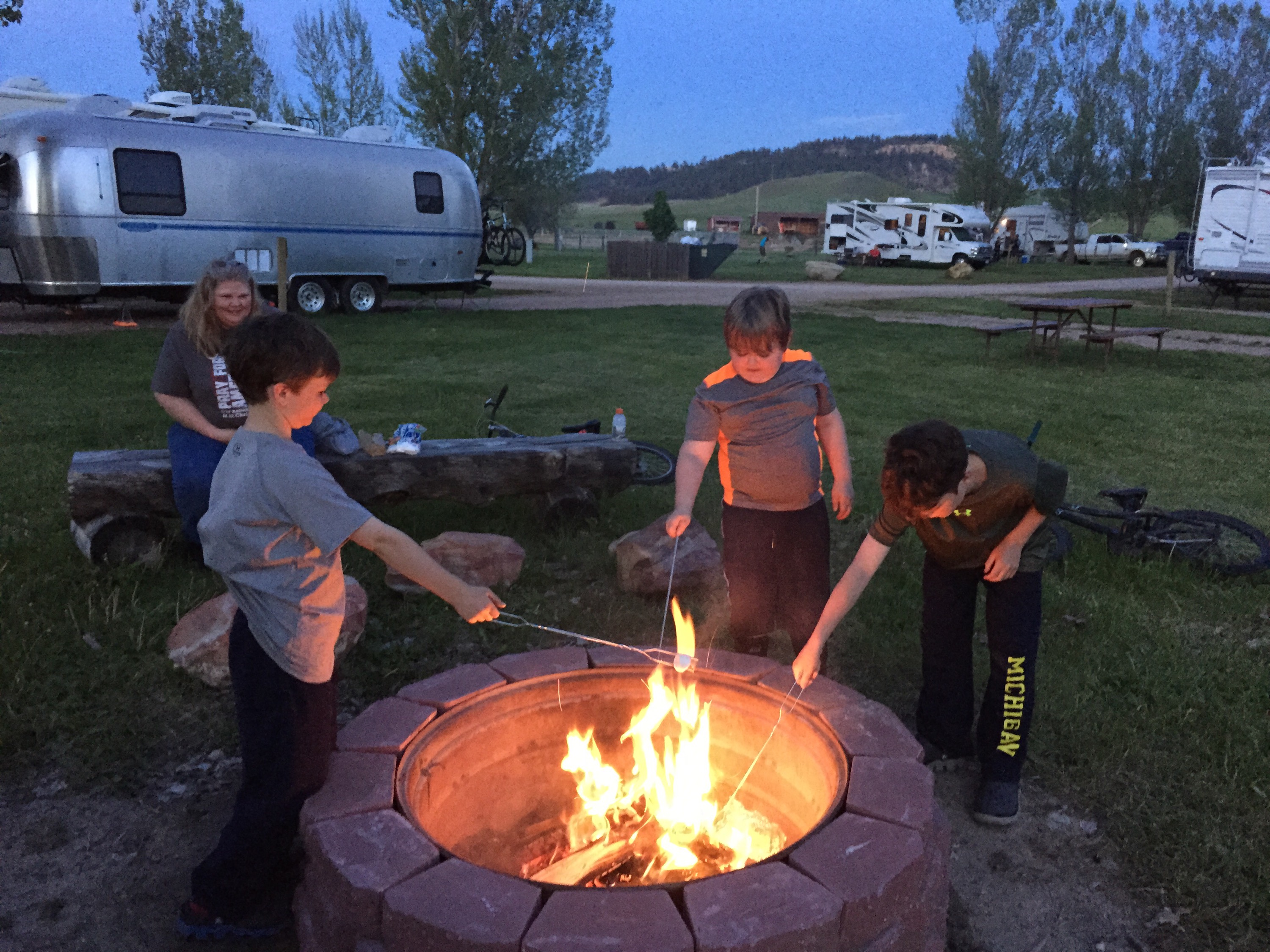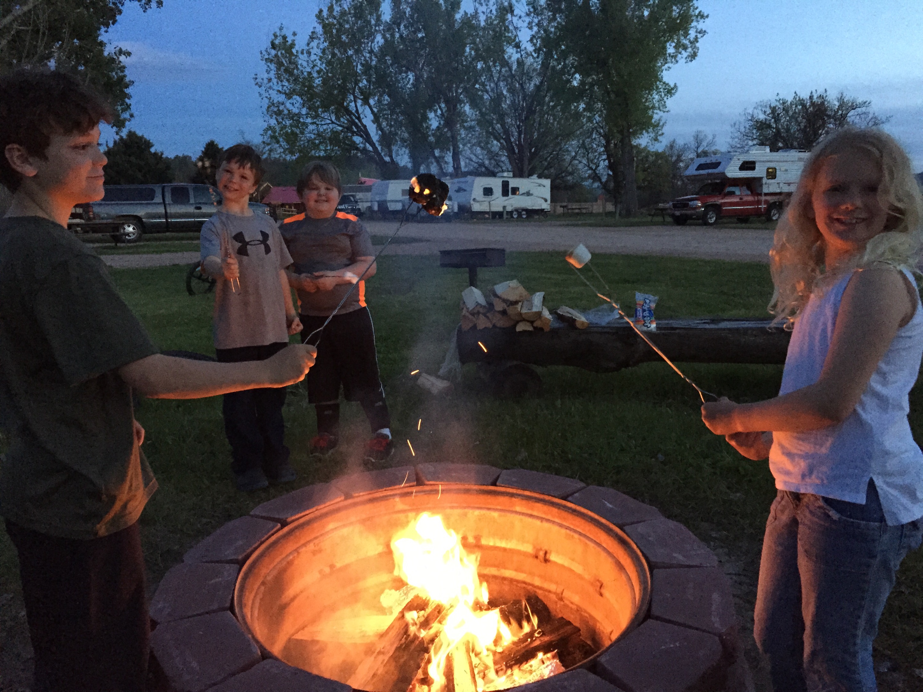I went to ask what time community bonfire started and they said they didn’t start them yet but we could buy wood and start it in the community pit. 😝 j and I were planning to cook foil packs in the fire for dinner so we got one started. People from the site next to us joined and we had a fun evening. Kids made s’mores then roasted all kids of extra marshmallows just for fun.