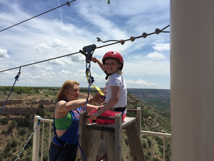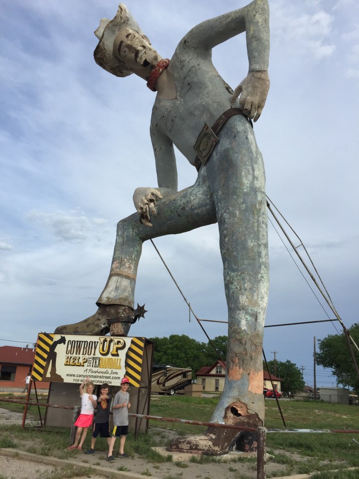 After much deliberating we decided to leave Oklahoma City today so we could come to Amarillo and zip-line and ride horses tomorrow. (The zip line was not for me, btw). We had an RV park in Amarillo planned, but it wasn’t till tomorrow because we thought we were in Oklahoma City for 2 days. (Good God!! The wind is so crazy I’m having a tough time writing clearly ππππ). Anyway, we found Palo Duro Canyon and Jason couldn’t pass up a zip line! I found a happy little trail ride for the family and our Oasis RV park was too far away. Lucky us! The zip line place has an RV park attached! Reviews were crummy but there were only a few and the complaints were silly. We decided it would be perfect for us. Only 1/2 mike from the horse place and AT the zip line place! The drive in was relatively uneventful. We stopped at Walmart to get a new coffee maker which led to being hungry and deciding to eat at a restaurant near there. We found a Mexican place that looked good and off we went! (In the wrong direction. A few times. Yelp was not cooperating!). Through a miracle – I mean my excellent navigation- we made it! They said it was right next to the giant cowboy. We found him!